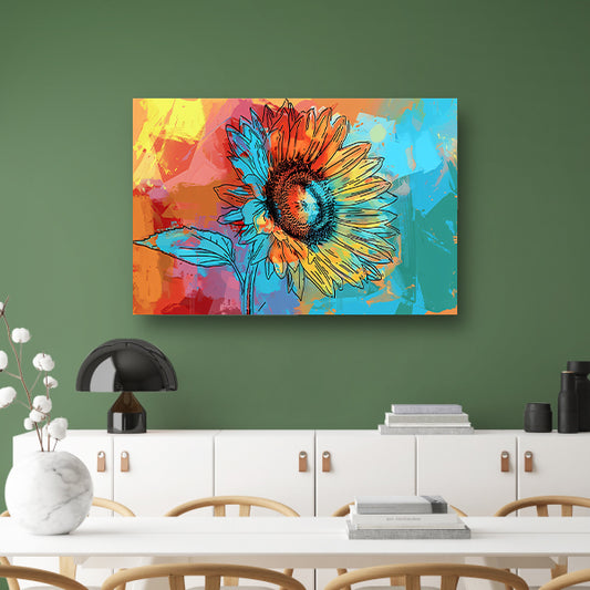 Abstracte kleurrijke zonnebloem schilderij met lijnwerk canvas