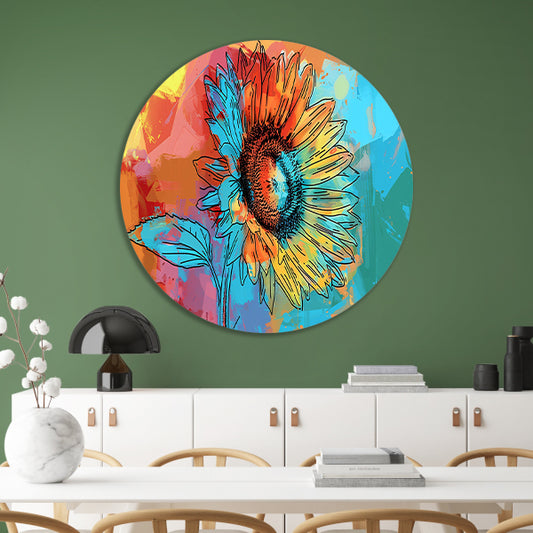 Abstracte kleurrijke zonnebloem schilderij met lijnwerk aluminium muurcirkel