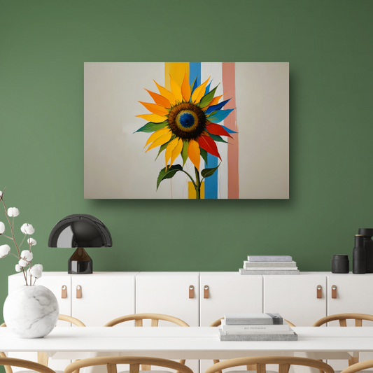 Abstracte Kleurrijke Zonnebloem op Gestreepte Achtergrond canvas met baklijst