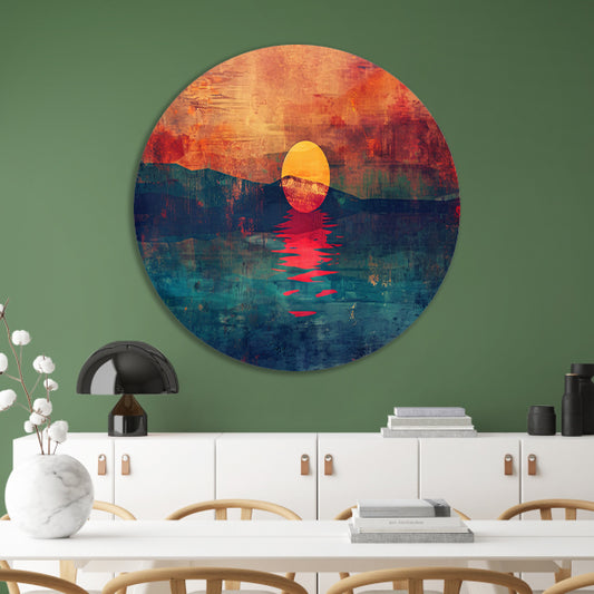 Abstracte kleurrijke zonsondergang over water aluminium muurcirkel