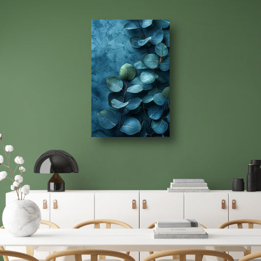 Abstracte kunst van bladeren op getextureerde blauwe achtergrond canvas met baklijst
