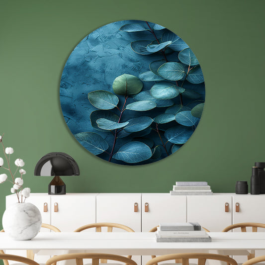 Abstracte kunst van bladeren op getextureerde blauwe achtergrond aluminium muurcirkel