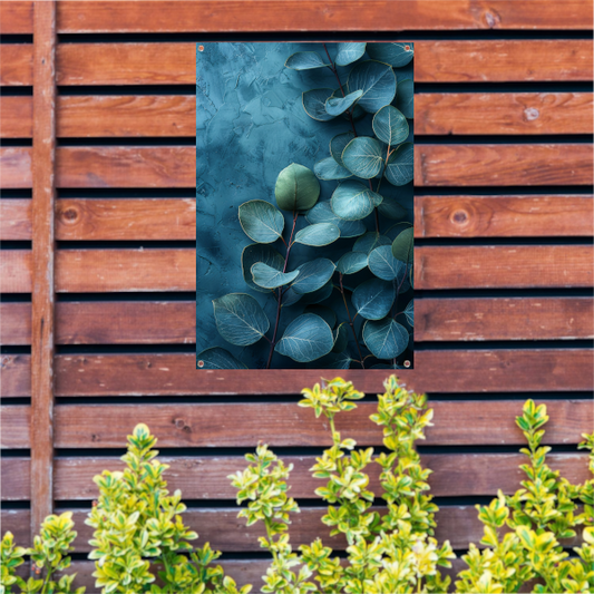 Abstracte kunst van bladeren op getextureerde blauwe achtergrond tuinposter