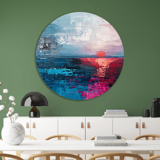Abstracte moderne schilderij van zonsondergang aluminium muurcirkel