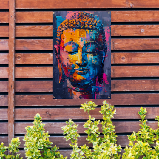 Abstract en kleurrijk Boeddha hoofd schilderij tuinposter