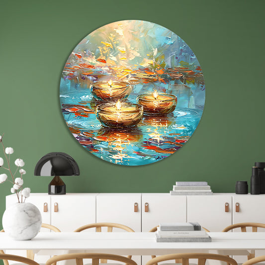 Abstracte schilderij van drijvende kaarsen aluminium muurcirkel