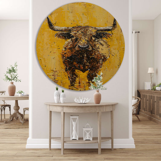 Abstracte schilderij van een stier op geel aluminium muurcirkel