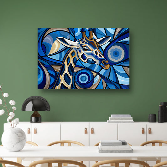 Abstracte schilderij van een giraffe in blauw canvas met baklijst