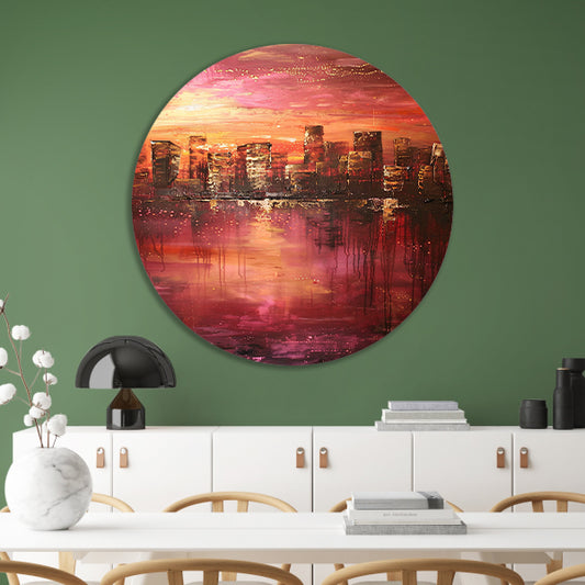 Abstracte skyline bij kleurrijke zonsondergang aluminium muurcirkel