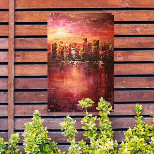 Abstracte skyline bij kleurrijke zonsondergang tuinposter