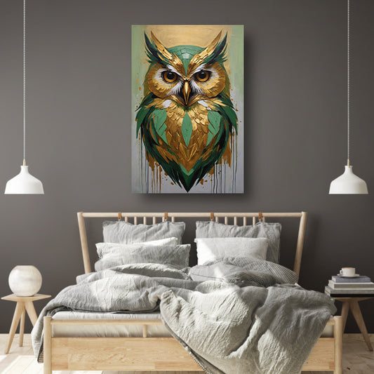 Abstracte Uil in Goud en Groen Tinten canvas met baklijst