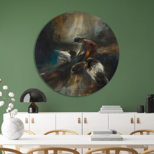 Abstracte voorstelling van vogels en mens aluminium muurcirkel