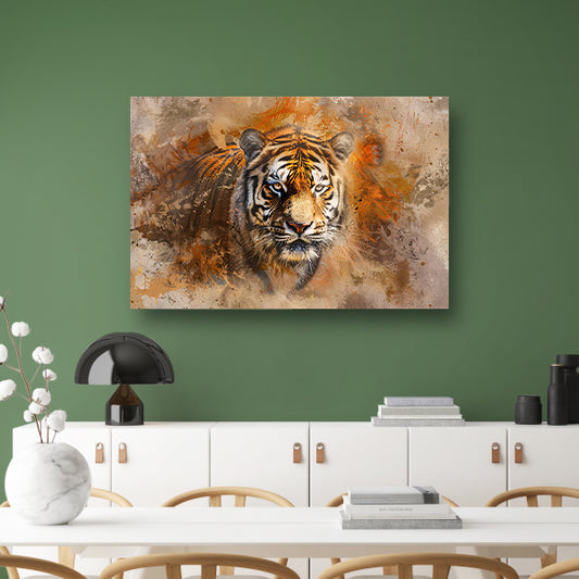 Abstract expressief tijgerportret in oranje tinten canvas met baklijst