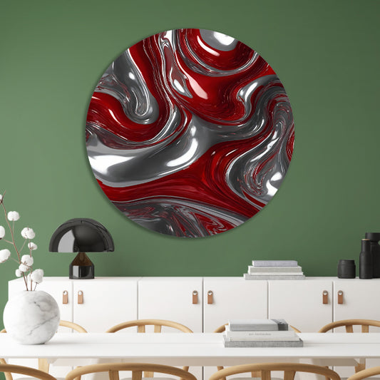 Abstracte Zilveren en Rode Vloeiende Dynamiek aluminium muurcirkel