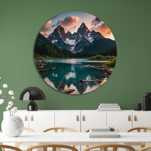 Adembenemend Berglandschap met Spiegelend Meer aluminium muurcirkel