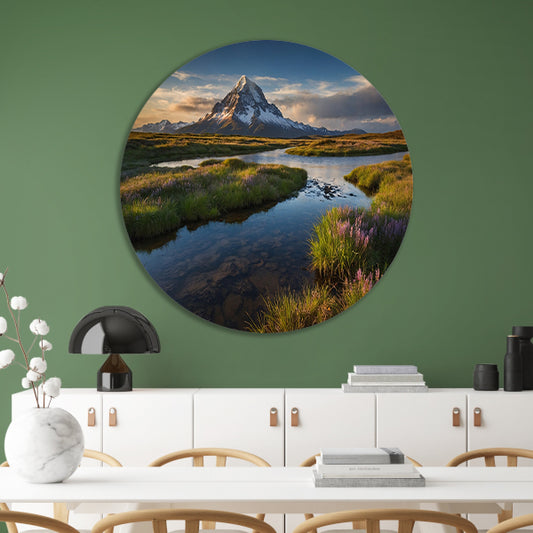 Adembenemend berglandschap met rivier en bloemen aluminium muurcirkel
