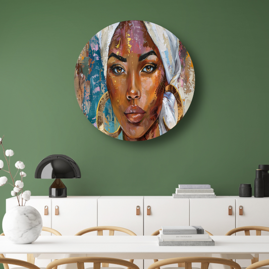 Afrikaanse vrouw met witte hoofddoek en gouden oorbellen forex muurcirkel