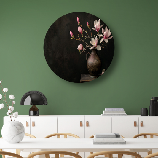 Antieke Vaas met Bloeiende Magnolia Tak aluminium muurcirkel
