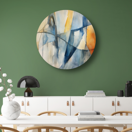 Aquarel compositie in blauw, geel en wit forex muurcirkel