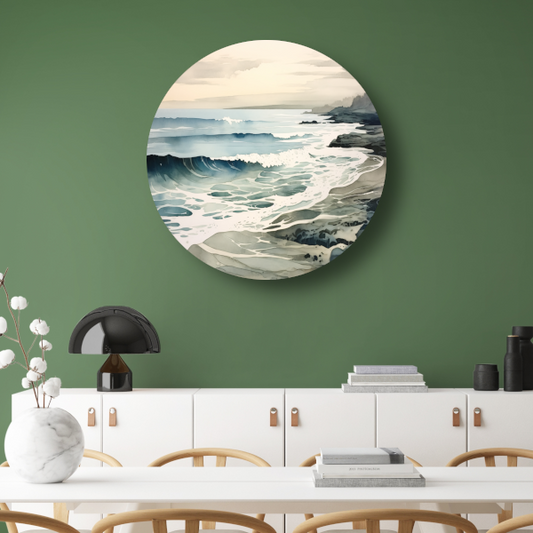 Aquarel compositie in blauw, geel en wit aluminium muurcirkel