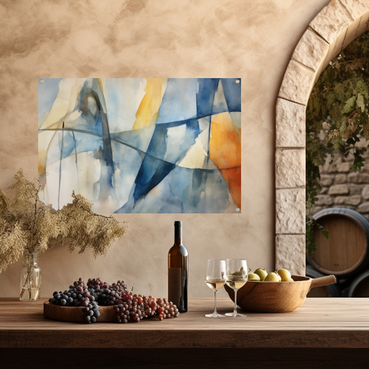 Aquarel compositie in blauw, geel en wit canvas met baklijst