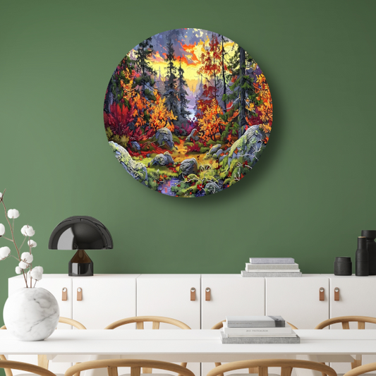 Avondzon door bomen aluminium muurcirkel