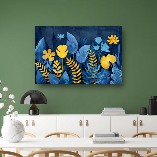 Blauwe en gele planten tegen donkerblauwe achtergrond canvas met baklijst