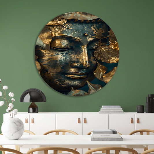 Blauwe en Gouden Boeddha met Bladmotieven aluminium muurcirkel