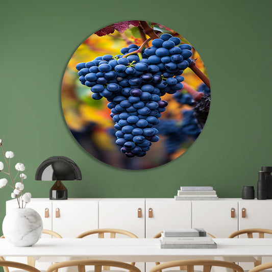 Blauwe druiven aan wijnrank in herfstlicht aluminium muurcirkel