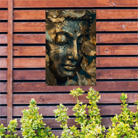 Blauwe en Gouden Boeddha met Bladmotieven tuinposter