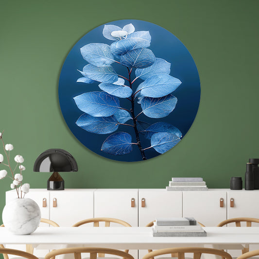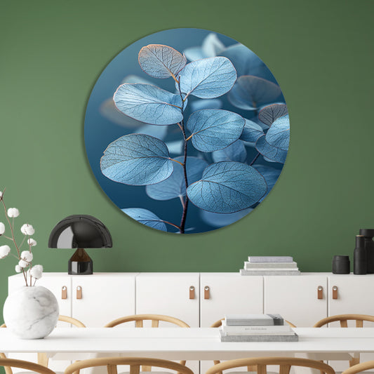 Blauwe eucalyptusbladeren in minimalistisch realisme aluminium muurcirkel