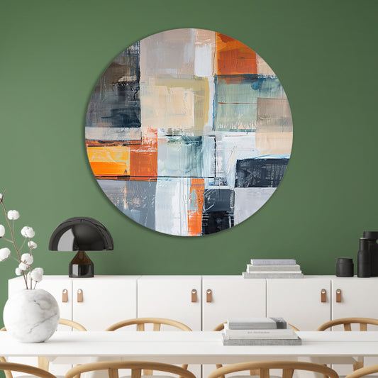 Abstract geometrisch schilderij met kleurblokken aluminium muurcirkel