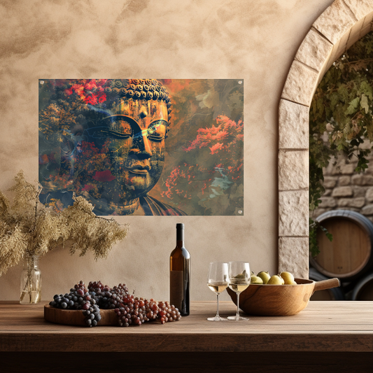 Boeddha in herfstpracht met kleurrijk bladerdek acrylglas