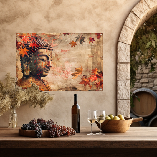 Boeddha in herfstpracht met kleurrijk bladerdek tuinposter