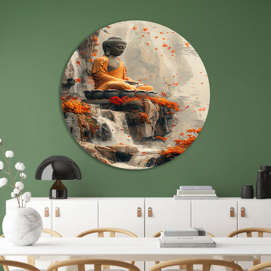 Boeddha in herfstdecor met waterval aluminium muurcirkel
