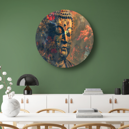 Boeddha in herfstpracht met kleurrijk bladerdek aluminium muurcirkel