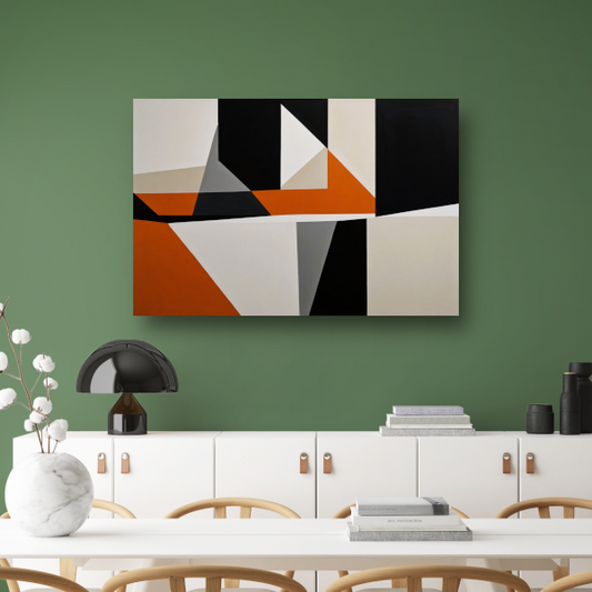 Abstract geometrisch spel van oranje en zwart canvas met baklijst