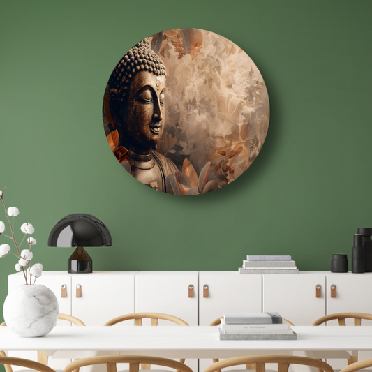 Boeddha met rode bloemen in sepia aluminium muurcirkel