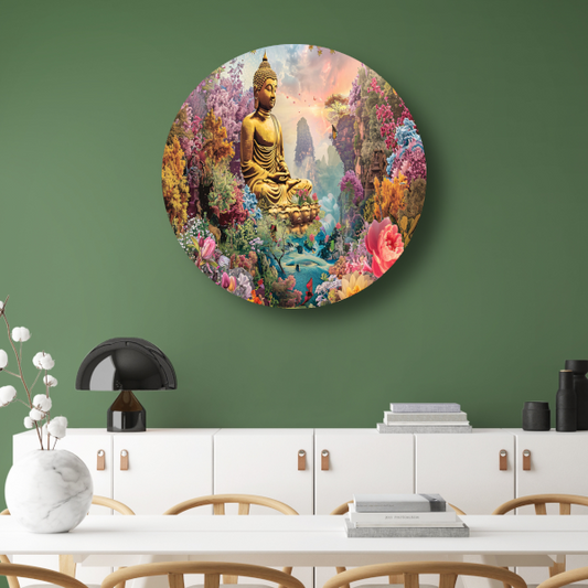 Boeddha Meditatie in Eclectische Bloementuin aluminium muurcirkel