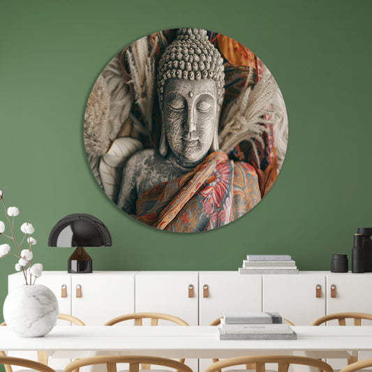 Boeddhabeeld met bloemen en rustieke kleuren aluminium muurcirkel