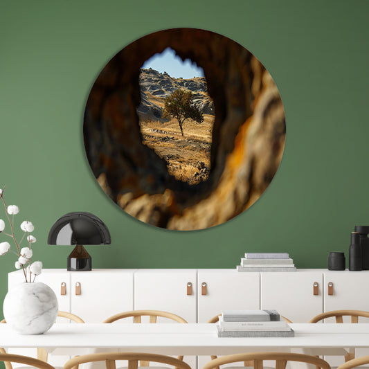 Boom gezien door rotsopening in heuvels aluminium muurcirkel