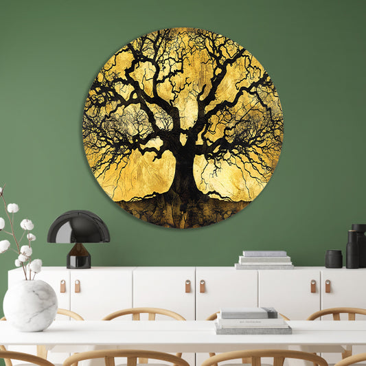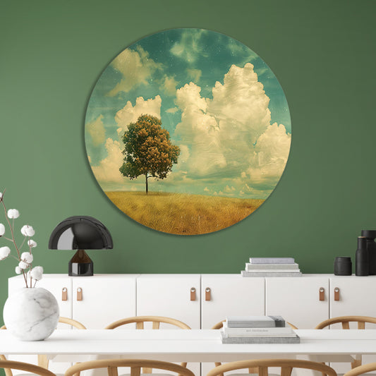 Boom in een uitgestrekt veld onder wolken aluminium muurcirkel