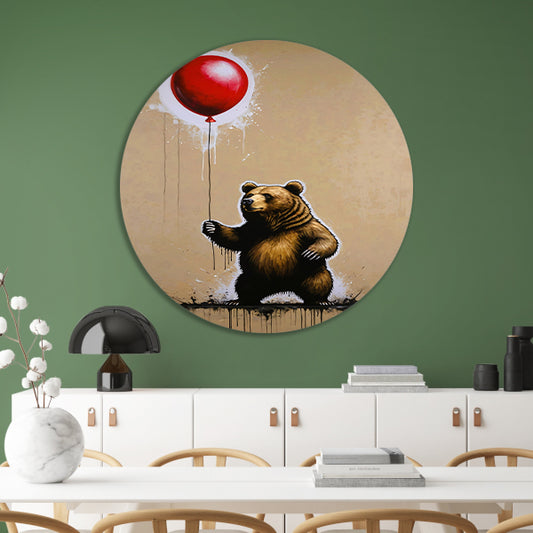 Bruine beer houdt een glanzende rode ballon vast aluminium muurcirkel
