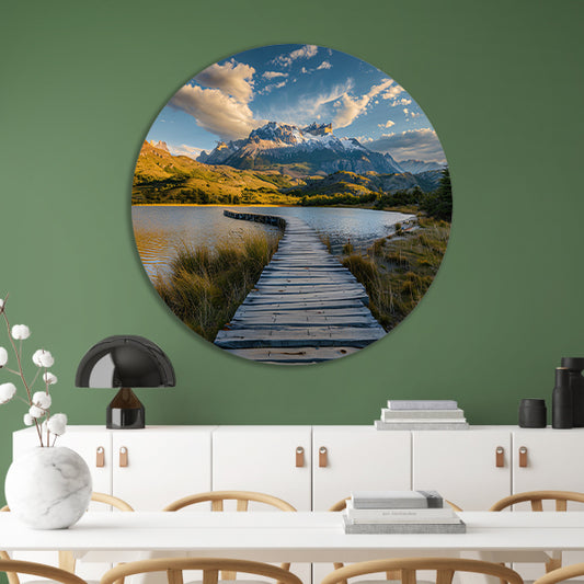 Brug naar serene berglandschap bij meer aluminium muurcirkel