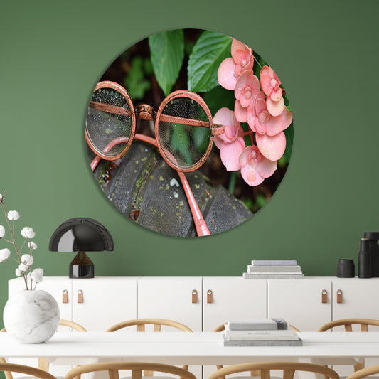 Bril met dauwdruppels en bloemen aluminium muurcirkel