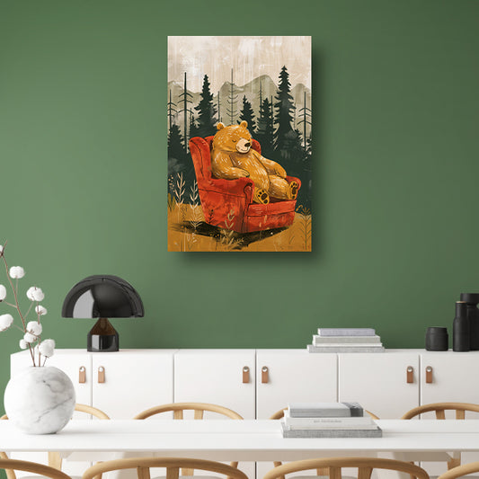 Bruine beer in rode fauteuil in bos aluminium muurcirkel