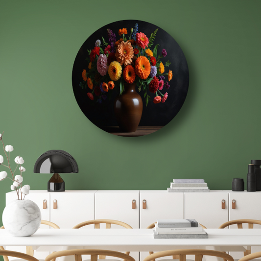Bruine vaas met kleurrijke bloemenpracht aluminium muurcirkel