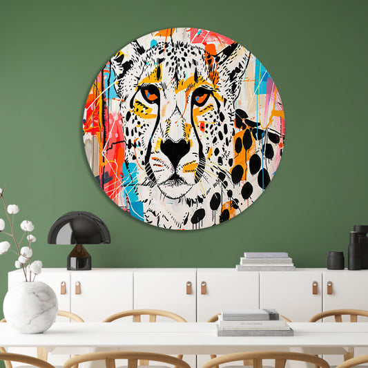 Cheetah schilderij in dynamische abstracte stijl aluminium muurcirkel