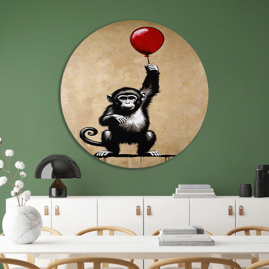 Chimpansee met rode ballon op beige achtergrond forex muurcirkel