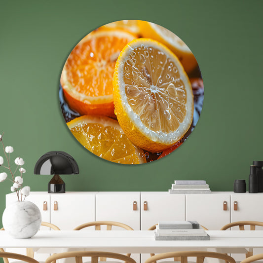 Citroenen en sinaasappels op snijplank aluminium muurcirkel